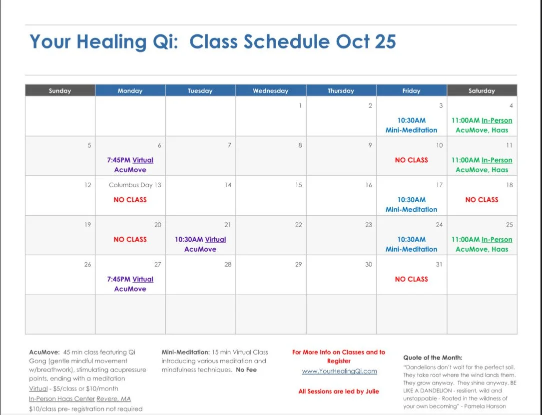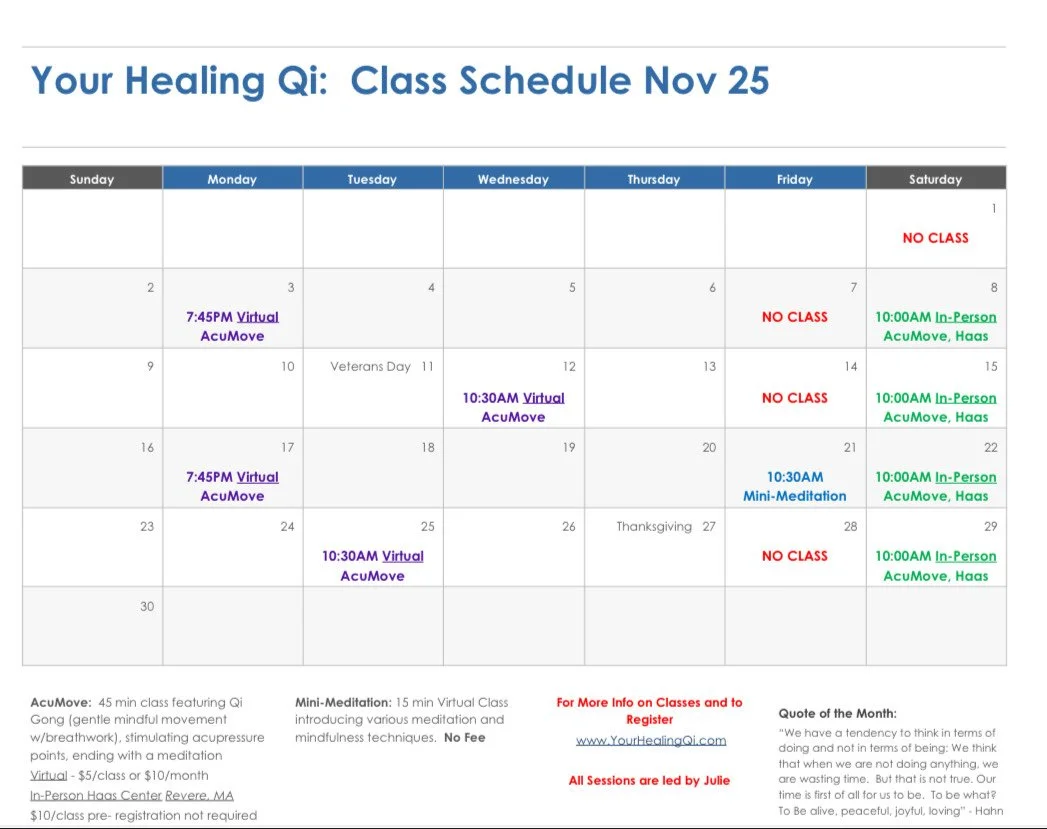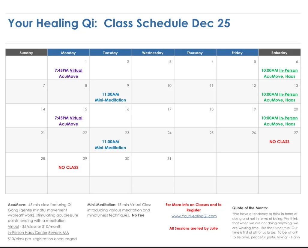 AcuMove is Julie's signature class featuring Qigong (gentle mindful movement with breathwork), stimulating acupressure points via self massage and tapping, and ending with a yoga nidra meditation to promote relaxation, rejuvenation and vitality for physical, emotional and spiritual well-being. No experience required. Offered both virtually and in person. See below for further details on the current month’s offerings and to register for a class.